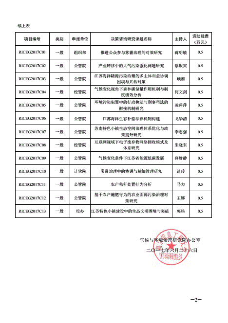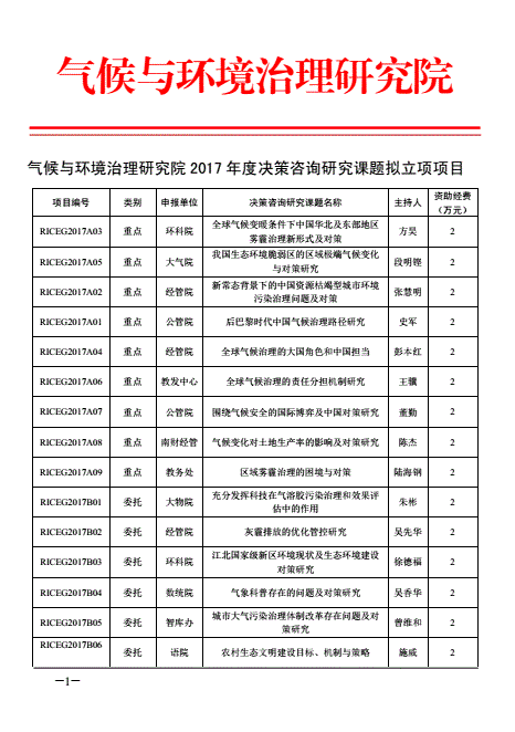 现将气候与环境治理研究院2017年度决策咨询研究课题拟立项资助的项目予以公示,公示时间:2017年6月27日—7月3日。对公示项目如有异议,请与智库办联系。如无异议,则于公示期过后正式立项,并正式签订项目合同书(邮件通知)。