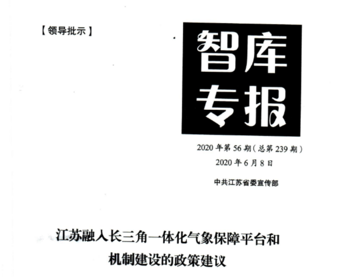 近日获悉,气候与环境治理研究院(南信智库)刊发于省委宣传部《智库专报》2020年第56期决策咨询成果《江苏融入长三角一体化气象保障平台和机制建设的政策建议》获江苏省副省长赵世勇肯定性批示,并作“请省气象局主动对接长三角一体化保障平台和机制,取长补短,共建共享“重要批示。