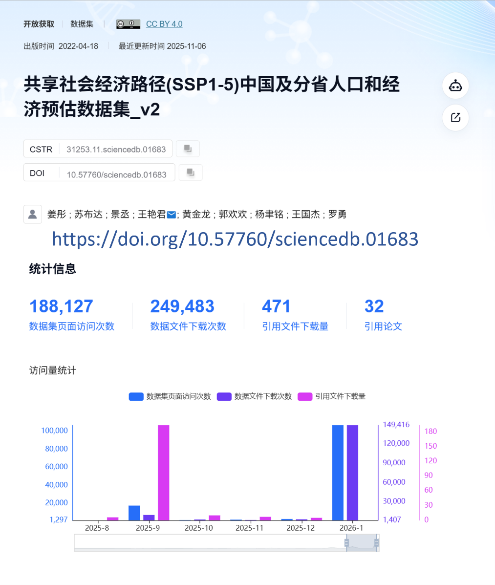近日,南京信息工程大学气候与环境治理研究院姜彤教授研究团队在科学数据银行(Science Data Bank)发布了5种共享社会经济路径(SSP1-5)下全球及中国人口经济高分辨率格点预估数据集v2。该数据集为发表的《共享社会经济路径人口和经济格点化数据库》更新版本,下载量已达16.7万余次。该数据集以2020年为基准年,分辨率为1km*1km的全球及中国人口总数与GDP数据。